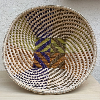 Workshop description: In this workshop students will learn how to weave a multicolor twill base with “cathead” base footing, continuous over two/under two side weave with undulating ridge, and a lashed rim. The result is a stunning decorative, open, bowl-shaped twill basket measuring 14” wide and 6” tall that can be used as a functional container or as a displayed art piece. This basket is not very flexible/adaptable in terms of size, design, and scope, so it is as you see it, except some weavers have chosen to make it slightly shorter, which slightly lessens the time it takes to weave.